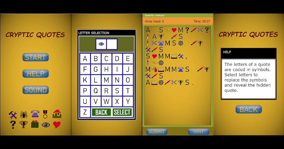 The letters of a randomly selected famous quote are coded in symbols. Your goal is to select the correct letters and reveal the hidden quote.